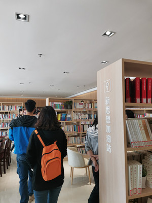 汤山街道文体服务中心内,设有江宁区图书馆汤山分馆图书借阅中心。走进图书馆,一排排整齐的书架首先吸引了馆员们的目光。书架上的书籍错落有致,书架间点缀着绿植,色彩明亮的桌椅十分舒适,不少读者流连其间。其中一个书架被命名为“新思想加油站”,放满了积极向上正能量的红色书籍,馆员们纷纷在此打卡留念。