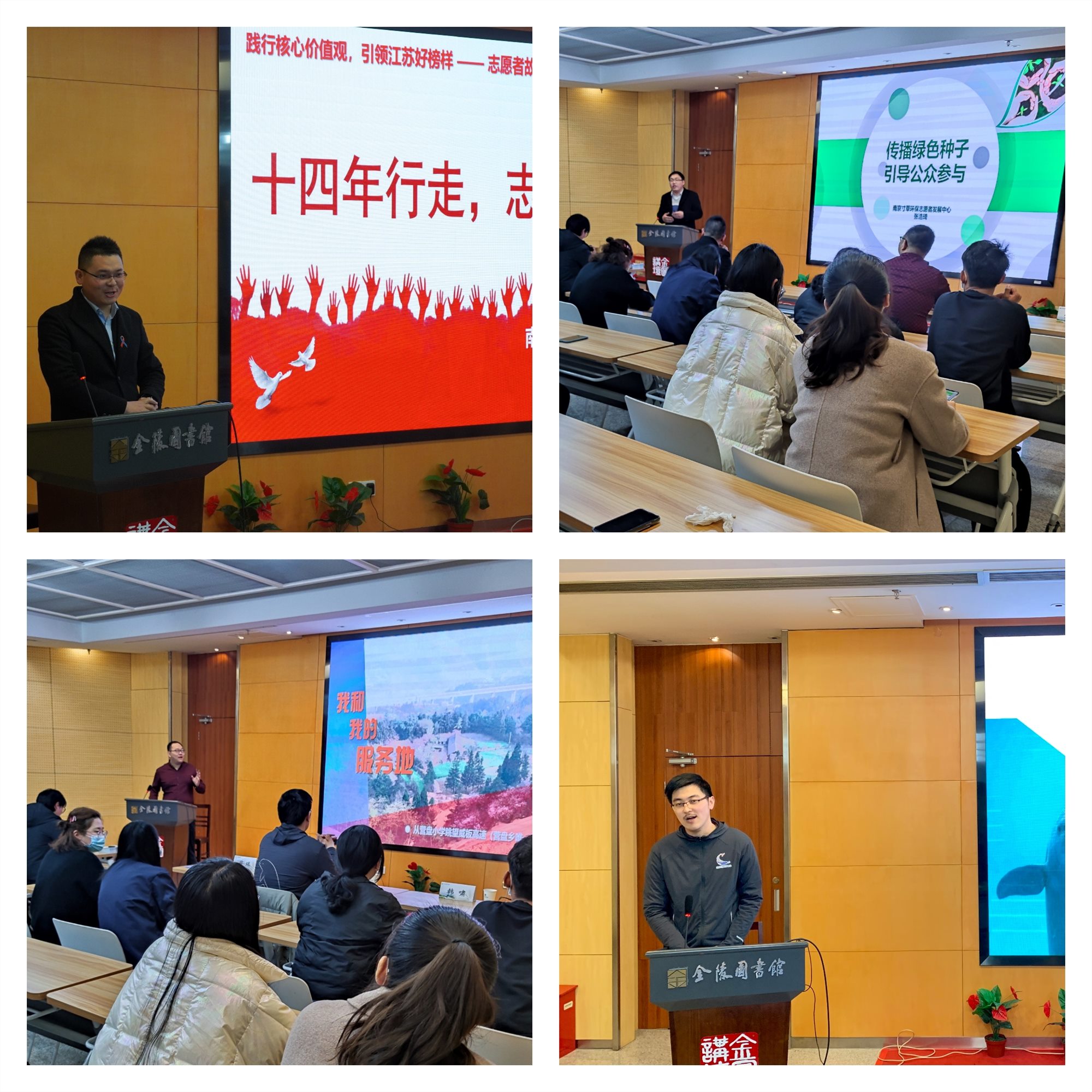 本次分享会邀请了四位南京市青年志愿者协会里积极投身志愿服务的优秀青年志愿者代表们,为金图馆员讲述新时代的雷锋故事,开展志愿服务工作交流,传授志愿服务优秀经验,激发馆员志愿服务活力。