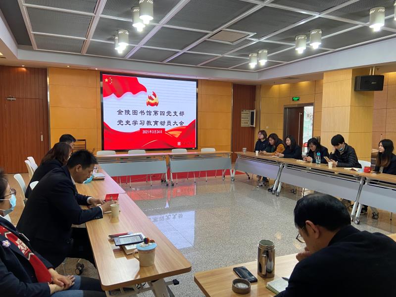 3月24日上午,金陵图书馆第四党支部在多功能厅召开党史学习教育动员大会,深入学习习近平总书记在党史学习教育动员大会上的讲话精神,全面贯彻落实党总支关于党史学习教育的工作安排。
