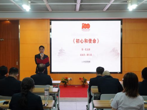 伴着激昂的乐曲,第四党支部首先为大家带来了原创诗朗诵《百年风华》,展现出这一百年来,无论形势多么复杂、环境怎么变化、任务如何艰巨,我们党都领导全国人民上下一心,创造了一个又一个“中国奇迹”。