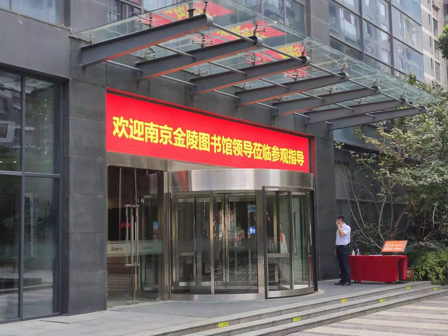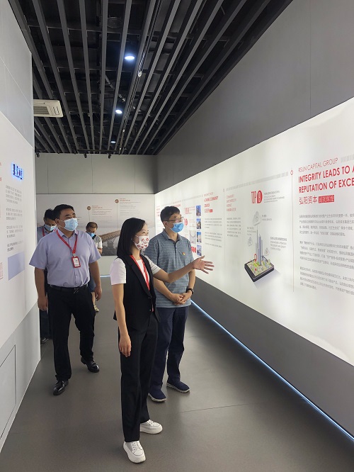 金陵图书馆第二党支部一行首先在一楼大厅观看了弘阳集团有限公司的宣传片,然后参观了企业文化墙、党建墙、办公区、党群服务中心、客户服务中心,并赠送了图书、期刊。弘阳物业服务集团有限公司刘明总经理、陈梅运营总经理及工作人员全程陪同,并做了详细介绍。