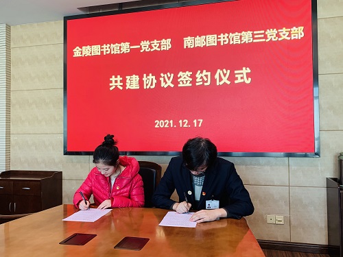 为庆祝中国共产党成立100周年,继续发扬党的光荣传统和优良作风,提升党建工作质量结合校地资源,积极创新红色文化教育服务,充分发挥党支部的战斗堡垒作用和党员先锋模范作用,2021年12月17日下午,中共金陵图书馆第一支部与中共南京邮电大学图书馆和档案馆第三支部于金陵图书馆会议室开展共建活动,双方代表研讨交流,并签署交流合作协议。