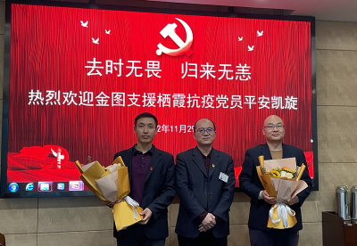 十月底,南京市栖霞区疫情防控形势十分严峻。在最紧要的关头,金图党员志愿者杨晓闻、刘世军同志积极响应党的号召,主动请缨、临危受命,奔赴第“疫”线栖霞区丁家庄、二桥高速卡口执行抗疫支援任务。经过20多天的抗疫支援,他们顺利完成任务并平安回到图书馆。11月29日下午,金图党总支为他们举行了欢迎仪式,党员志愿者杨晓闻、刘世军分别讲述各自在抗疫过程中亲身经历的故事,再现了一幕幕真实感人的战“疫”场景。