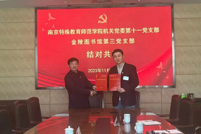 为深入学习贯彻习近平新时代中国特色社会主义思想,进一步加强党支部建设,创新党建工作方法和载体,推动党支部标准化、规范化建设,2023年11月23日下午,金陵图书馆第三党支部与南京特殊教育师范学院机关党委第十一党支部开展结对共建活动。