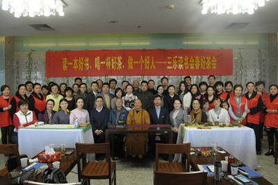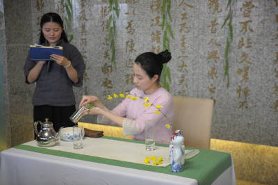 沙龙的第二个主题是“喝一杯好茶”。在现场,书友会的会员们欣赏到江南时报社《江南茶道》主编彭锦芳女士领衔的熹园申时茶、禅茶十八式。“禅茶十八式”由清凉禅茶班表演,一位做详细的介绍和说明,而另一位则配合演示,从“礼佛”、“调息”到“洗杯”、“烫壶”,再到“观色”、“品茶”、“回味”、“谢茶”,一共十八个步骤,禅茶班依次演示。他们的“表演”也博得了现场书友会成员的热烈掌声。彭主编认为,品赏禅茶的过程是一个修身养性,强身健体的过程。