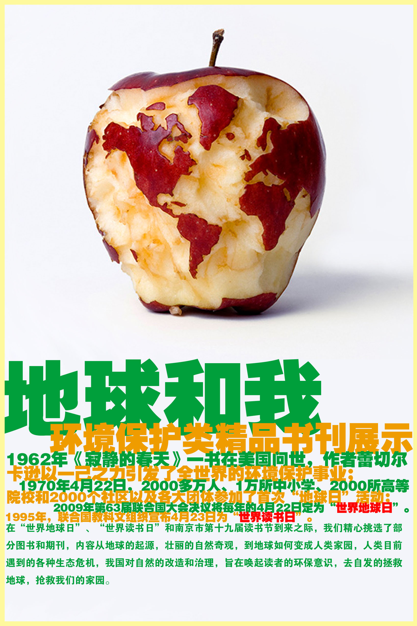 在“世界地球日”、“世界读书日”和南京市第十九届读书节到来之际,我们精心挑选了一部分图书和期刊,内容从地球的起源,壮丽的自然奇观,到地球如何变成人类家园,人类目前遇到的各种生态危机,我国对自然的改造和治理,旨在唤起读者的环保意识,去自发的拯救地球,抢救我们的家园。