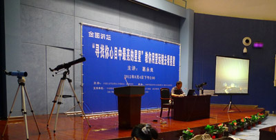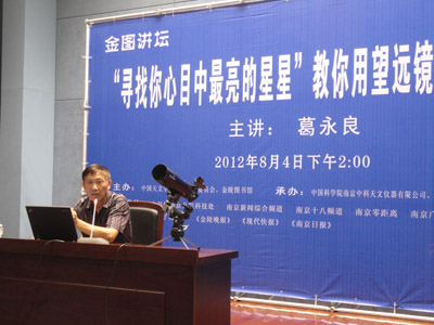 “仰望星空,无穷的魅力引人畅想”,8月4日下午,“金图讲坛”的讲台摆放着长的、短的、高的、低的望远镜,俨然一个小型天文观测台,中国科学院紫金山天文台专家葛永良先生为广大天文爱好者带来了一场“寻找你心目中最亮的星星”——教你用望远镜去看星星的讲座。