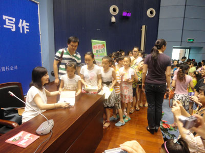 “阳光姐姐”的讲座别具一格,讲座中还跟小听众们做起了有趣的有奖提问游戏,奖品是印有她邮箱和QQ号的精美书香卡,大大地激发了小听众们的兴趣,他们踊跃举手发言回答问题,并大胆发表自己的想法。精彩的演讲,有趣的提问,巧妙的回答,引起了大家阵阵掌声和笑声,使整个会场充满了快乐的气氛。