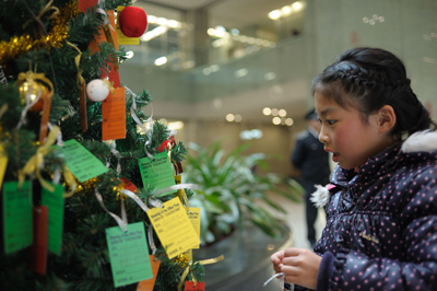 每年的12月25日是西方的圣诞节,今年的圣诞节期间,金陵图书馆倾情推出“会说话的圣诞树”圣诞特别活动,受到读者的积极响应,尤其是孩子们的强烈喜爱。12月15、16日双休日,圣诞树活动一经推出,短短2天,图书馆大厅里绿油油的圣诞树上就缀满了500多张读者们写满好书推荐和心愿祝福的圣诞卡片,让圣诞树“说”出每个人对南京、对图书馆、对家人、对自己最诚挚的祝福。