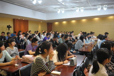 李家华教授温文尔雅,平易近人,对人生职业生涯规划方面有着独到的见解。100多位来自南京信息工程大学、南京艺术学院等各大高校的学生慕名前来听讲,在讲座之后向李教授提出了一些与就业前景、职业选择与规划等息息相关的问题,李教授都一一给予切合实际的建议和指导。针对一位朋友提出的关于创业问题,李教授说项目、资金、团队这个金字塔三要素中,最重要的是有一支能干的团队,然后有一点想法,想法体现成计划性文字,最后变成行动力,就离成功不远了。