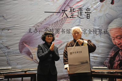 金陵图书馆曹亚卿书记致辞,向读者朋友拜年,并向金陵琴社社长、国家级非物质文化遗产代表性传承人刘正春先生携弟子在新春之际将要带给我们的一场音乐饕餮之宴表示感谢,并代表图书馆向刘正春先生赠送新春贺礼。