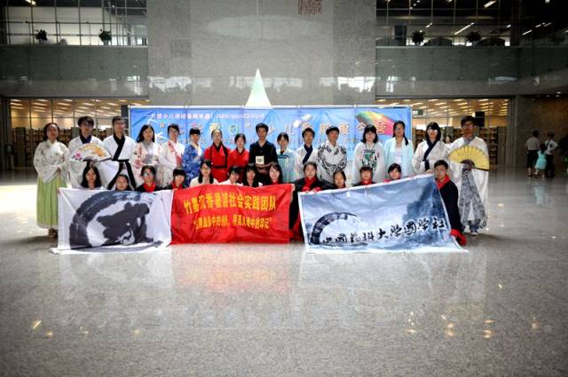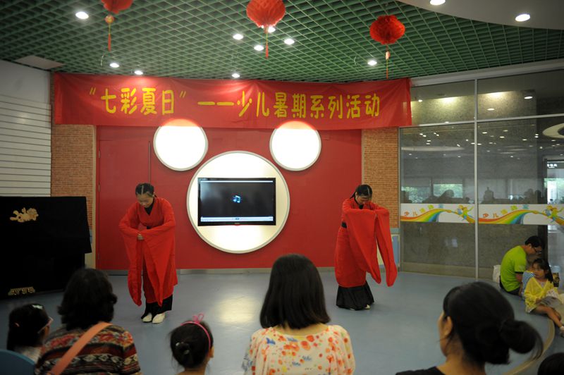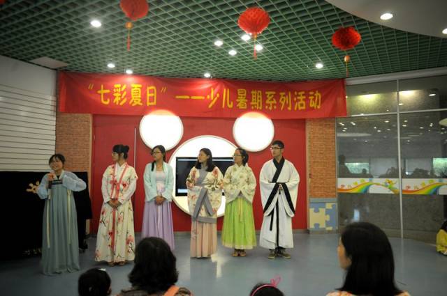 7月15日上午,是七彩夏日【红蜻蜓国学堂】第二天,中国药科大学国学社的同学们身着古典的汉服来到金陵图书馆的亲子活动室,为小朋友们家长们带来了一场以国学为主题的游园体验。