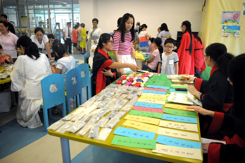 活动现场分为若干区域,有的区域上演了美轮美奂的古风舞蹈;有的区域展示了中国传统的剪纸艺术;有的区域向小朋友们示范了如何制作具有古典气息的发簪和饰品;有的区域专门教授古典礼仪;还有的区域向小朋友们介绍了一些有趣的中药知识,舞台上还像小朋友们表演了女子成人礼仪式。