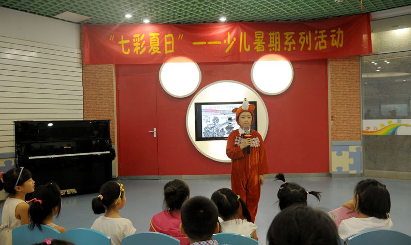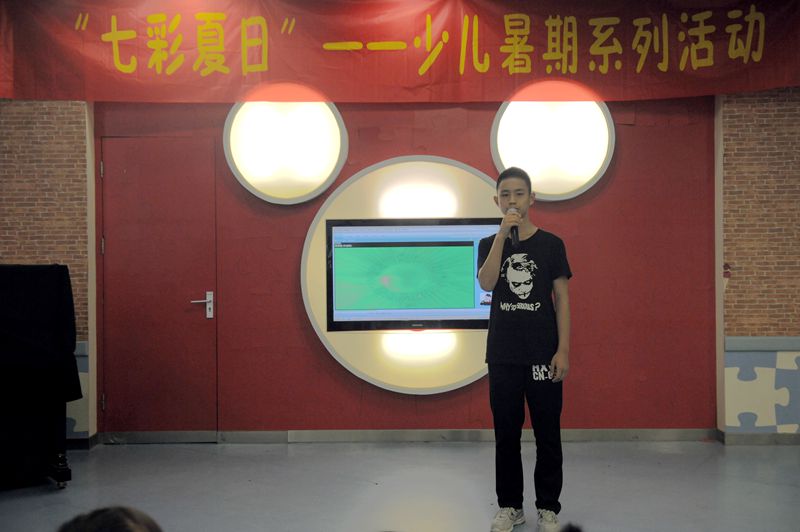 7月18日下午14:00 “‘七彩夏日’——2015金陵图书馆少儿暑期夏令营”的“紫藤萝大舞台”第二期活动正式开始,这次有一位小朋友主动要求来做小小主持人,接下来我们就跟他一起来看表演吧!