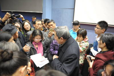 清晨8点,天空还飘着雨,图书馆门外已排起了长队,阴冷的天气仍然阻挡不了家长们望子成龙的关爱之心。喻老师拥有大批粉丝,吸引了家长、学生近700余名,有意思的是,有些带孩子来一起听讲座的家长也曾经是喻老师学生。和前几讲一样,除了主会场之外,图书馆悉心预备的两处分会场也很快满员,稍晚进场的家长站着听到了最后。