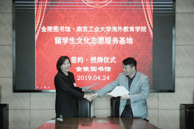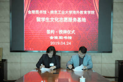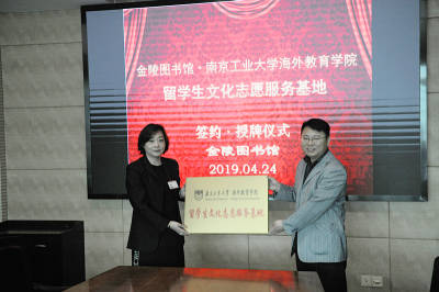 随后,杨峥副馆长与伏永祥书记签订了《南京工业大学外教育学院留学生文化志愿服务基地共建协议书》。伏永祥书记向金陵图书馆授予“留学生文化志愿服务基地”铜牌,杨峥馆长代表金图接受铜牌。