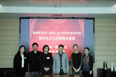 2019年4月24日星期三上午9:30,南京工业大学海外教育学院留学生文化志愿服务基地签约暨授牌仪式在金陵图书馆四楼会议室举行。海外教育学院书记伏永祥、副院长王飞、留办主任彭蕾等学院师生代表出席签约·授牌仪式,金陵图书馆副馆长杨峥、文创发展部副主任马骥、副主任周樱格代表金图接受了“南京工业大学海外教育学院留学生文化志愿服务基地”铜牌并表示感谢。