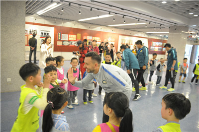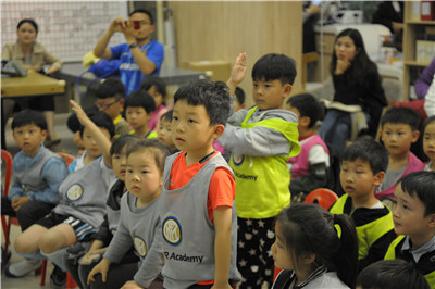 在老师设下问题“究竟是什么让威利获得胜利”让孩子们思考的同时,国际米兰Bruno教练邀请了7个孩子上台排练了一段“威利带球、过人、传球、射门”的场景,用实地演绎的方式还原了书中的精彩片段,帮助孩子们更好地理解故事的内核,明白了“魔术师威利”的魔法其实正是他对梦想的努力与坚持。