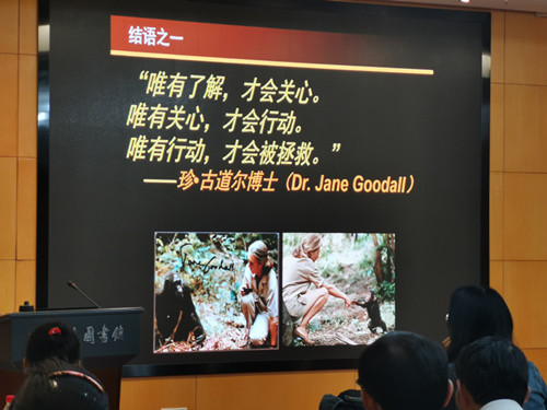 最后,陈老师引用了著名动物学家珍•古道尔博士的话作为结束语:“唯有了解,才会关心。唯有关心,才会行动。唯有行动,才会被拯救”。我们的国家, 山川壮丽,物产丰隆,生物多样,世界称雄,保护它们就是保护人类自己,从我开始,从拒绝野生动物制品、宣传野生动物知识开始!