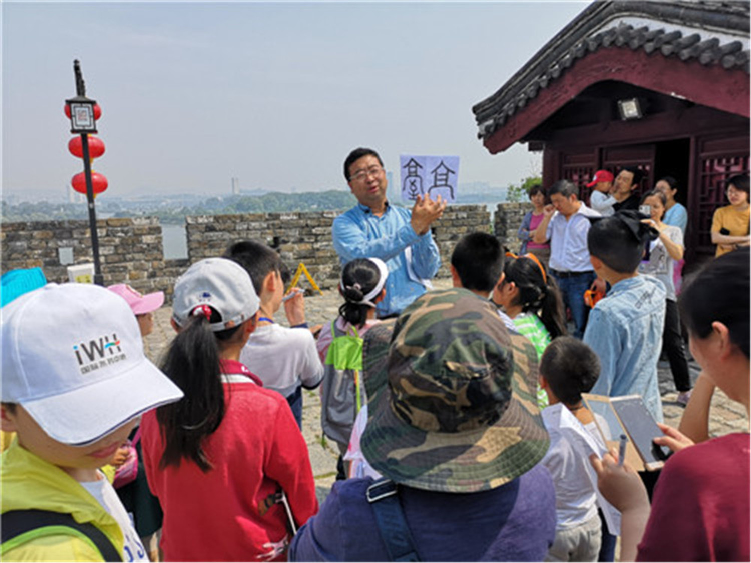 在城墙上仁和老师举起手中的“至”和“到”字开始讲解。接着又讲到了“臺”字,我们说的台城的“台”字在古代就是这个“臺”字,是说我们来到了很高很高的地方,台城的意思就是地基很高的城墙。