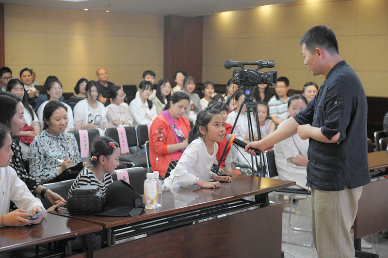 开场,易教授抛出“为什么要学诗”这样一个问题。天真无邪的孩子们各种“花式”的回答令人莞尔。易教授则分享了自己的认识,他说:学诗的一个重要理由是去“我”,诗中凝聚了人类文明的精华、深藏着人类历史的国画,读诗,可以让孩子了解社会是如何运作的,把人的“自然属性”转化为“社会属性”,助力构建舒适愉悦的和谐社会。