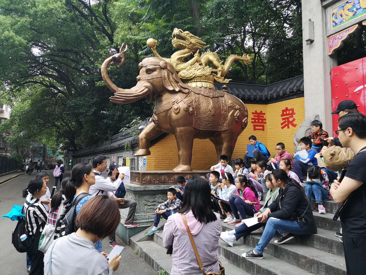 “你们再看”,仁和老师指着公园大门口的两尊像,“你们看这两尊像是哪两个动物组成的”。“大象和龙”同学们异口同声的说到,仁和老师向大家讲述,这就叫佛门龙象,水行中龙力气大,陆行中象力气大,故用这两张动物比喻修行勇猛有最大能力者,也用来形容高僧大德,你们以后去其他寺庙,看到佛门龙象,这里供奉的一定是高僧。
