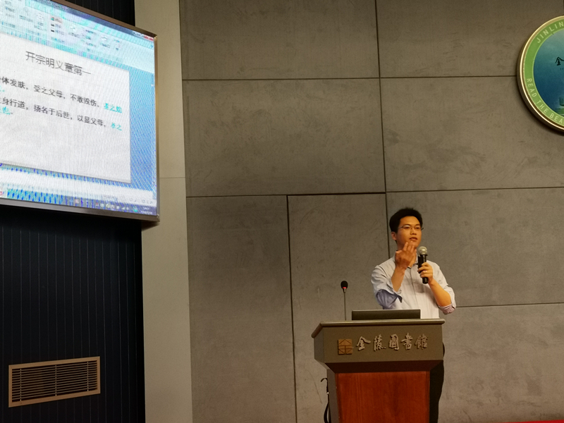 5月26日下午2点,在金陵图书馆报告厅举办了“习经堂”《孝经》精讲(二),主讲人是中国古典文献学博士、南京晓庄学院文学院讲师郎文行老师。