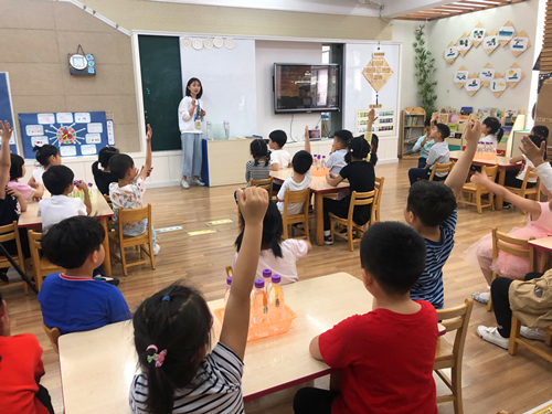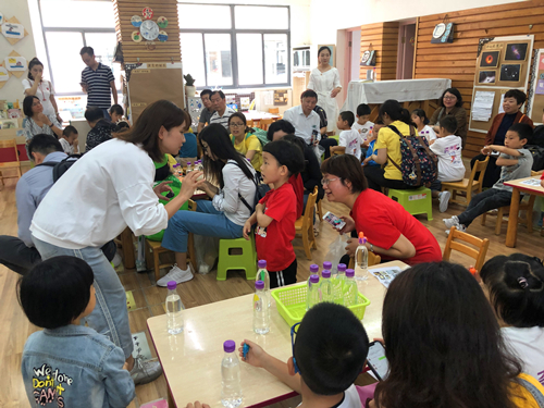 活动一开始,老师们向孩子们展示了本次科学活动的实验材料章鱼浮沉子和装满水的塑料瓶。随后,又通过视频和现场讲授教孩子们如何让小章鱼在瓶子里浮浮沉沉和快速的旋转:双手用力捏住水瓶,章鱼就会下沉,手放松章鱼就会上浮;而如果连续捏放水瓶,章鱼就会旋转起来。