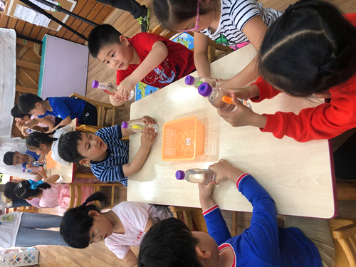 听完看完老师的讲解和示范,小朋友们跃跃欲试,拿起瓶子,亲身体验浮沉实验。看着小章鱼随着双手的捏放在瓶子里上上下下,章鱼的触须张开旋转,小朋友们的脸上都露出了灿烂的笑容。