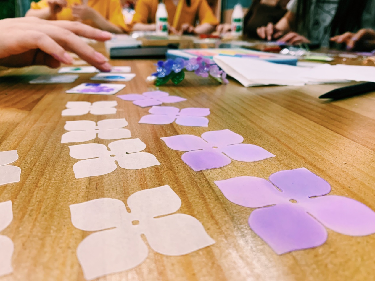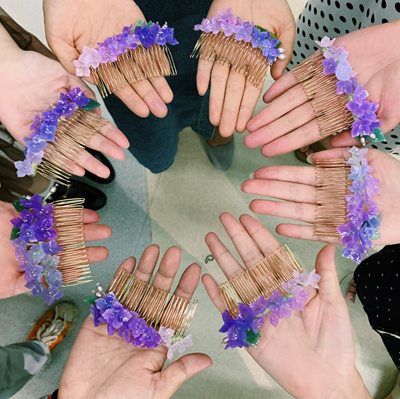 这次活动请来的泡泡眼老师,是制作热缩片的高手,春天时她的樱花发簪课带领大家首次体验热缩片的魅力,这次活动则是延续之前与大家的约定——紫阳花开的时候,做一把玲珑剔透的发插。