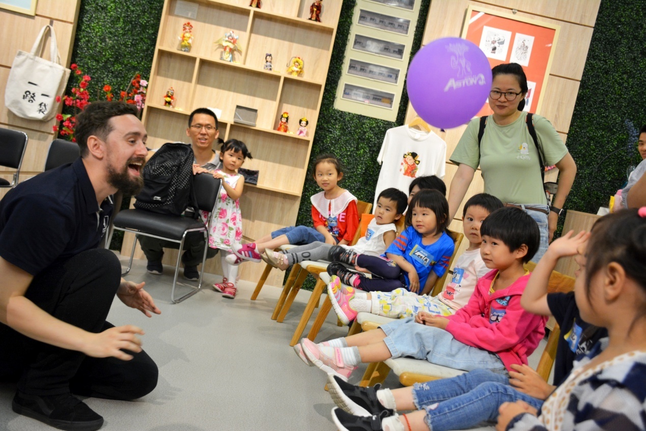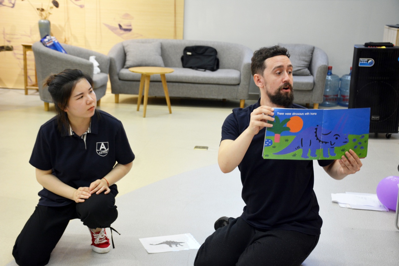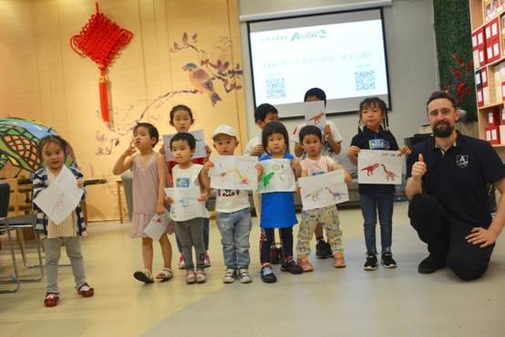 活动开始,Calum老师先和孩子们相互自我介绍,并借助互相传递气球的小游戏顺利进行了暖场。然后,他手捧绘本,用英语向孩子们介绍:很久很久以前,世界上有很多各式各样的恐龙……孩子们听得非常认真,积极地学习着关于恐龙的各个新单词,场面十分温馨和谐。