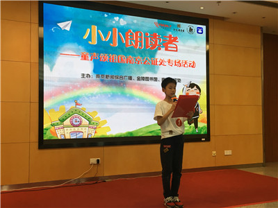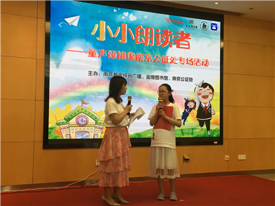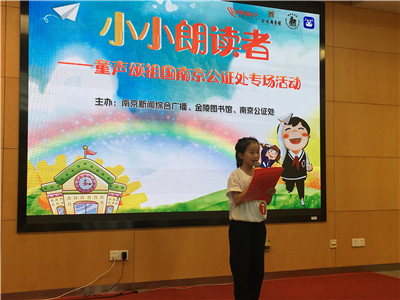 7月7日下午,由南京新闻广播、金陵图书馆、南京公证处联合举办的“童声颂祖国——小小朗读者”南京公证处专场活动在金陵图书馆多功能厅举行。活动由南京新闻广播台主持人文青主持,南京新闻广播总监束忱、南京市南京公证处主任刘庆宁、南京市南京公证处副主任陈国桥、南京市南京公证处金融科技部部长王芃等嘉宾出席了活动,南京新闻广播副总监 赵永晨、金陵图书馆馆员 “朗读者”项目负责人张婕、南京新闻广播主持人一级播音员江枫担任评委。18位小小朗读者依次进行了精彩的个人展示赛。