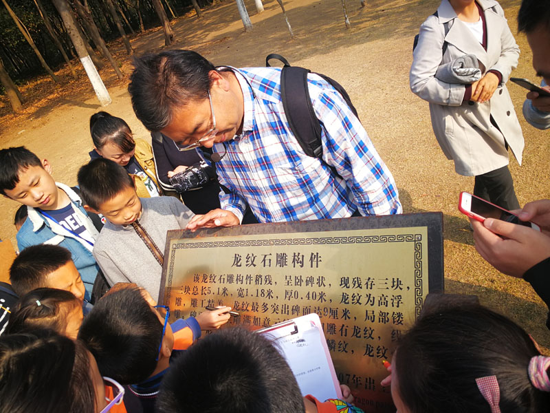 首先映入眼帘的是一块上面刻着龙的石雕,仁和老师告诉大家,它的名字叫“龙纹石雕构件”。 龙纹石雕构件为神烈碑亭的遗物,现已断裂成三块,下马坊公园内是其中的一块,碑面中间雕一五爪龙纹,线条流畅,形象逼真。石雕对面的神烈山碑即为明代神烈碑亭的所在地,可惜原有的方形碑亭已经倒塌。在这里,仁和老师由此碑亭引申,给大家讲了很多当年朱元璋和马皇后的故事,以及明朝最惨烈的夺位之争,靖难之变前后的历史。孩子们全神贯注地听着,仿佛自己已随波逐流置身于明朝之中。