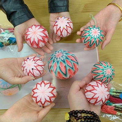 这款手鞠的独特之处在于,它所使用的丝线是用于刺绣的细线,由三股线绣制,可以直接捻成一股,也可以按照老师的样品将三股线一根根排列整齐。学员们听完讲解后纷纷表示,要提高难度,挑战一下排列整齐的绣法。因为虽然捻成一股线绣制起来更快,但是排列整齐的绣线会有如同刺绣的缎面绣一样,富有光泽。老师讲解了如何分绣线、如何利用分球纸带定位,以及具体的菊式绣法之后,大家就开始制作。虽然这款手鞠的制作方法并不复杂,但是如果想要达到完美的效果,需要的不仅是耐心,还有时间。