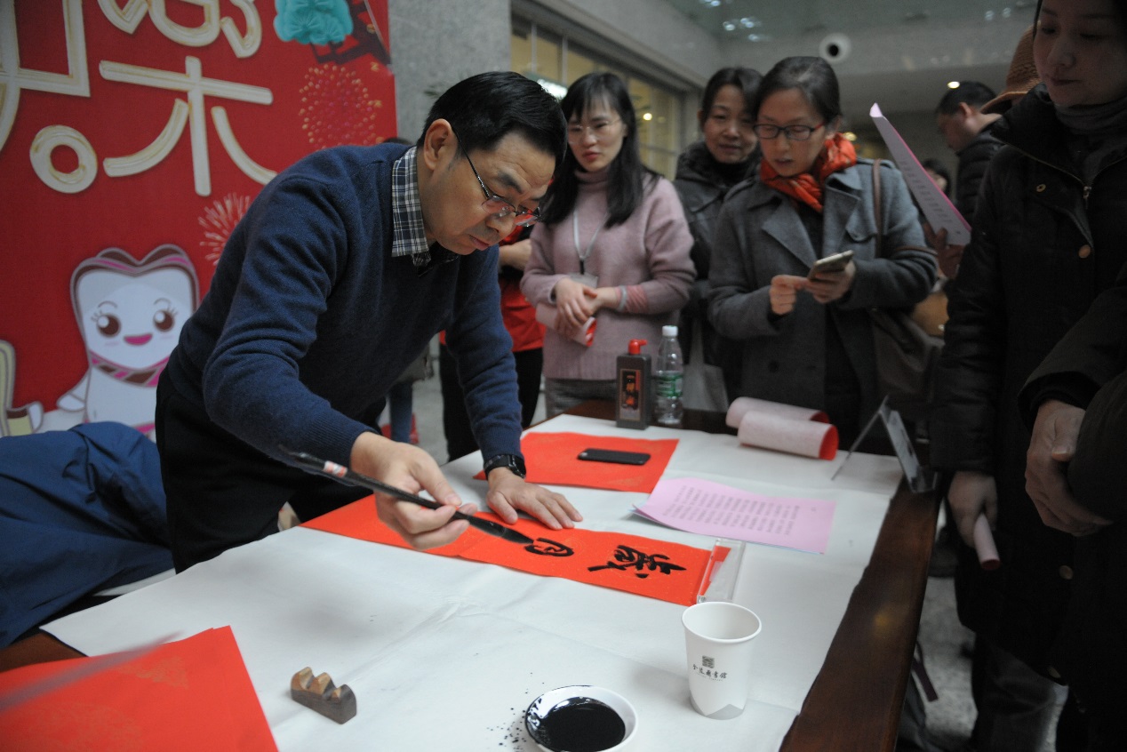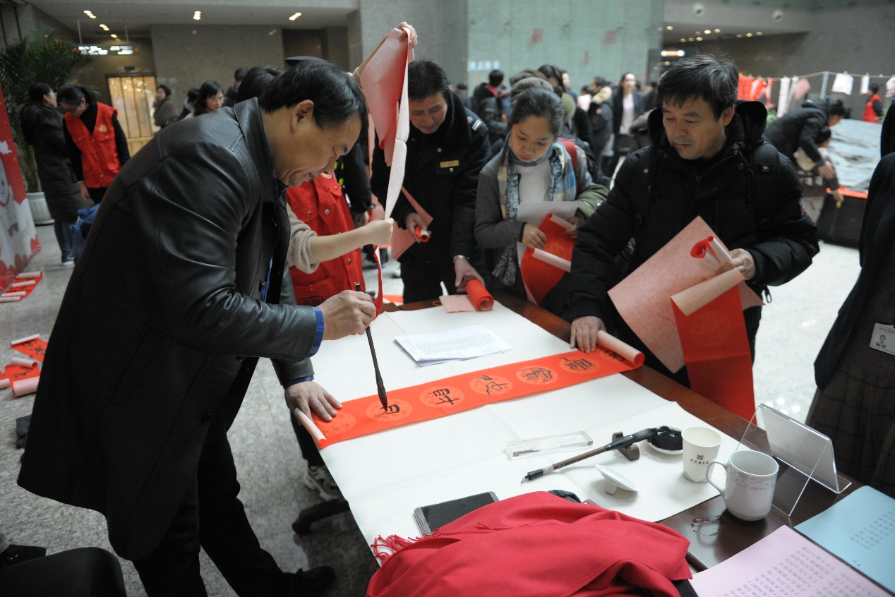 春联从旧时的桃符延续至今,成为春节必不可少的传统习俗。一幅幅大红喜庆的春联中,既有楹联文化,又有书法艺术,更有着文化志愿者的新年祝福。本次活动共送出近千幅现场书写、墨香飘逸的春联和“福”字,不仅受到众多新老读者的青睐,还吸引了来自南京工业大学海外教育学院外国留学生友人的参与,他们很喜欢中国的传统文化,同时也把南京视为自己的第二家乡,非常高兴能和南京市民一起体验春节民俗,喜迎中国年。