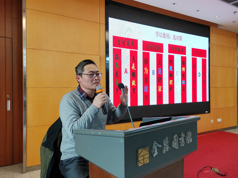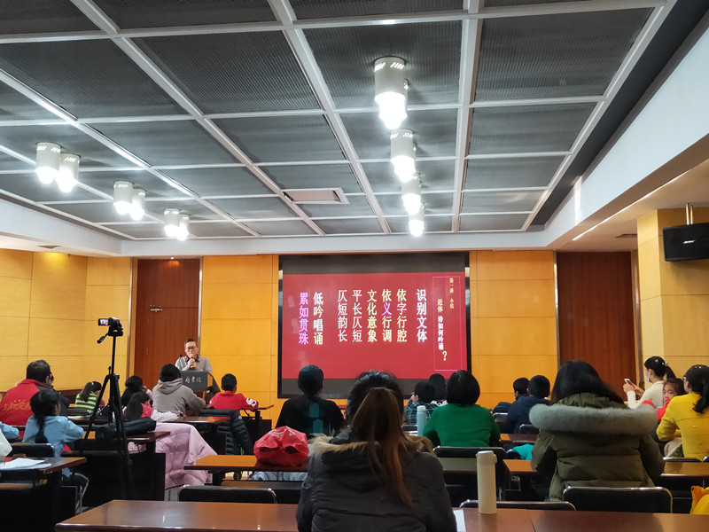 1月19日下午14:00,在金陵图书馆一楼多功能厅,“习经堂”国学精英培育班的“诗词吟诵”课程如期开展。本次课的主题是古体诗的吟诵指导及赏析,由南京非遗学院正高级教师、江苏省语文特级教师程道明老师主讲,主要内容为上古歌谣及诗经篇吟诵。“习经堂”的学员及家长和部分读者一起参与了本次课程。