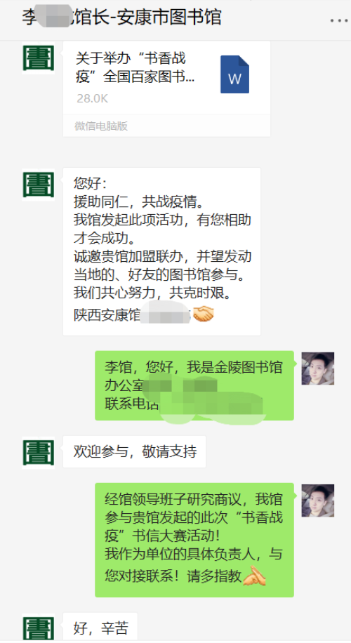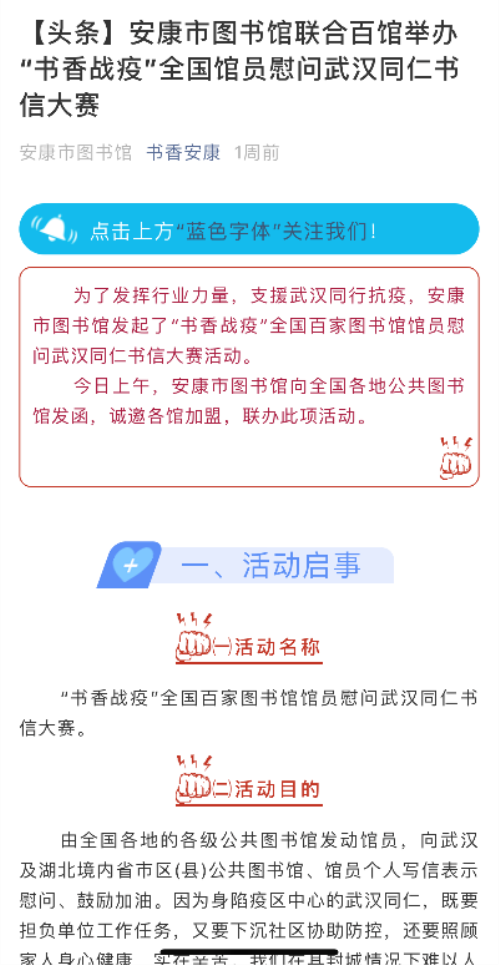 为了在给湖北省、武汉市图书馆同仁更多的精神关怀和鼓励,我馆决定响应此次活动,并迅速在馆内发出“书香战疫”书信大赛活动通知,发动馆员积极参与,希望借此书信的方式给予业界同仁更多的温暖和力量。与此同时,我馆安排专人负责与安康市图书馆对接相关工作。