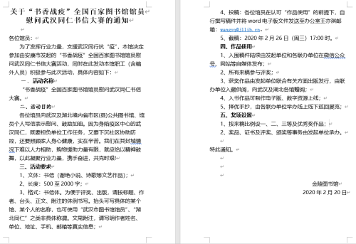 2月19日,金陵图书馆在线上收到安康市图书馆发来的《关于举办“书香战疫”全国百家图书馆慰问武汉同仁书信大赛的邀请函》。
