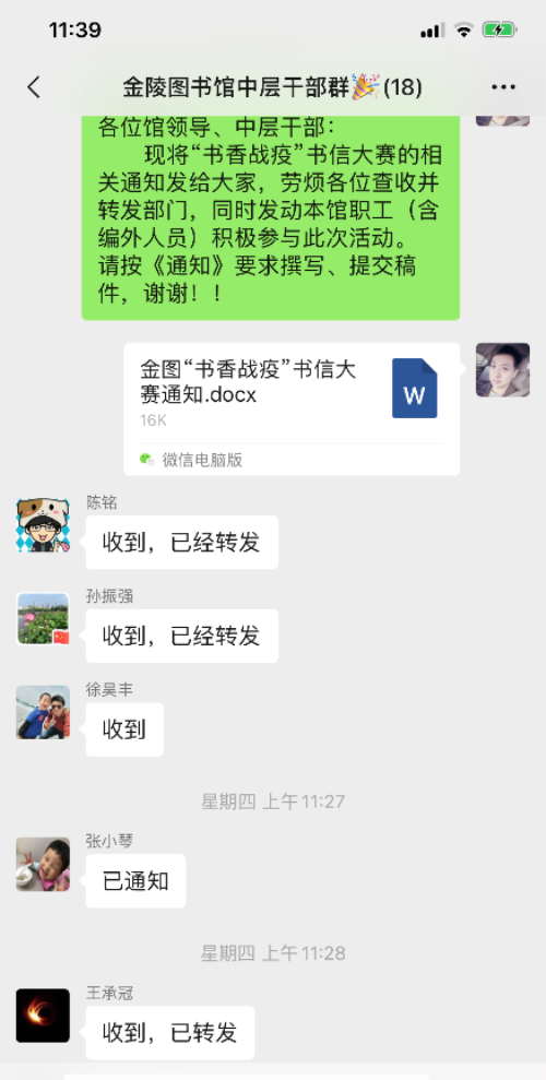 此次 “书香战疫”书信大赛活动得到了馆员们的积极响应,在不到一周的征稿时间里,收到“信件”28封。书信写作风格各有不同,有的短小精干,有的情文并茂,有的徜徉恣肆;书信内容表达各有侧重,既有美好的回忆,也有殷切的希望,更有真挚的祝福!