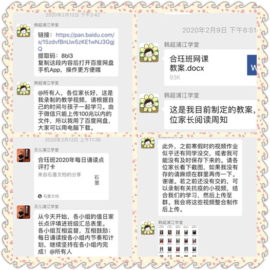 2月初,根据浦江学堂总部和金陵图书馆的建议,合珏班韩超老师制定了网络学习计划,录制教学视频,利用网络平台继续开展课程学习。自2月12日开始,韩超老师已经陆续了上传12次课程。在自学课程之外,班主任陆老师也全程督促孩子们诵读打卡,每一位孩子都坚持每天诵读上传音视频,形成了良好的学习氛围。