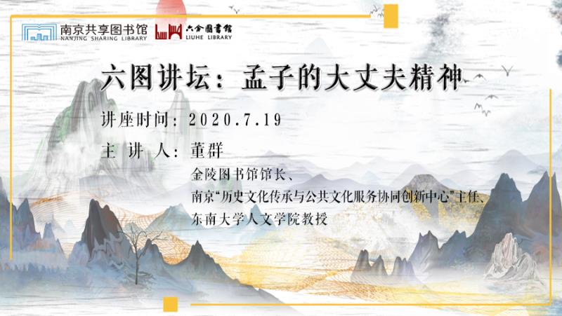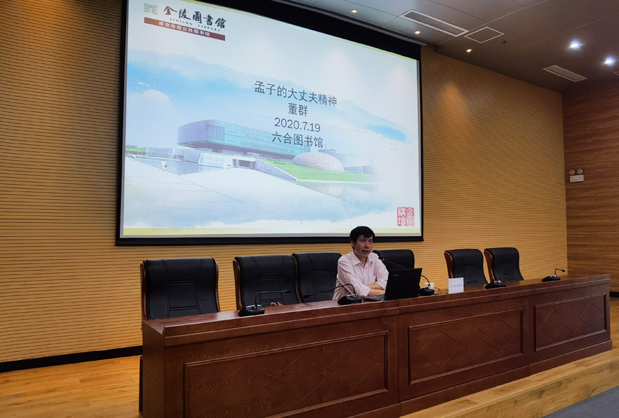 为推进落实2020年政府购买公益文化服务项目,2020年7月19日,金陵图书馆馆长、南京“历史文化传承与公共文化服务协同创新中心”主任、东南大学人文学院教授董群先生做客六合区图书馆,主讲“孟子的大丈夫精神”。金陵图书馆副馆长杨峥,文创发展部副主任周樱格、孙雨陪同前往。