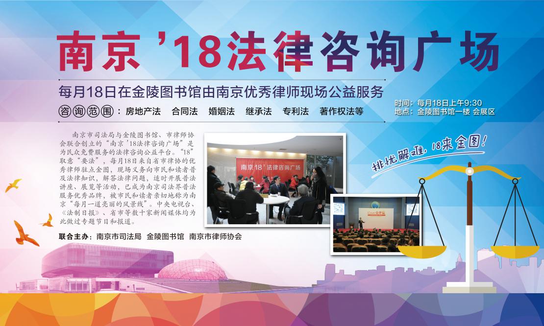 “南京18’法律咨询广场”起始于1994年12月18日,由金陵图书馆与南京市司法局、市律师协会共同创建。2018年4月,“南京18法律咨询广场”市、区联动再出发,以金陵图书馆为主会场,全市11个区、12个公共图书馆为分会场,在每月18日同时开展法律公益咨询活动,弘法济民,已成为南京市公共文化和法律领域普法文化特色品牌。