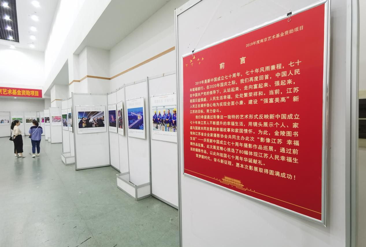 2020年9月18日,2019年度南京艺术基金资助项目《“影像江苏 幸福生活”——庆祝新中国成立七十周年摄影作品巡展》首站在马鞍山市图书馆开展。此次展览在南京市艺术基金办公室的指导下,由金陵图书馆、江苏省企业家摄影协会共同主办,马鞍山市图书馆承办。上午10点,展览开幕式在马鞍山市图书馆展览厅举办,出席此次展览开幕式的有马鞍山市文化和旅游局副局长郎杰、金陵图书馆副馆长杨峥、江苏省企业家摄影协会名誉主席朱卫华、马鞍山市图书馆馆长王月堂、马鞍山市图书馆书记胡俊等。