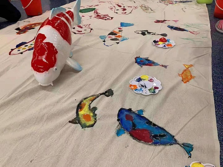 小朋友们在老师的指导下,整齐地分布在画布旁,用手中的画笔跟随老师的指导,一笔一笔地画出一条条曲线优美的、色彩明亮的锦鲤,不多时,画布上就布满了形态各异的锦鲤,带着绘画者给予它们的旺盛的生命力。