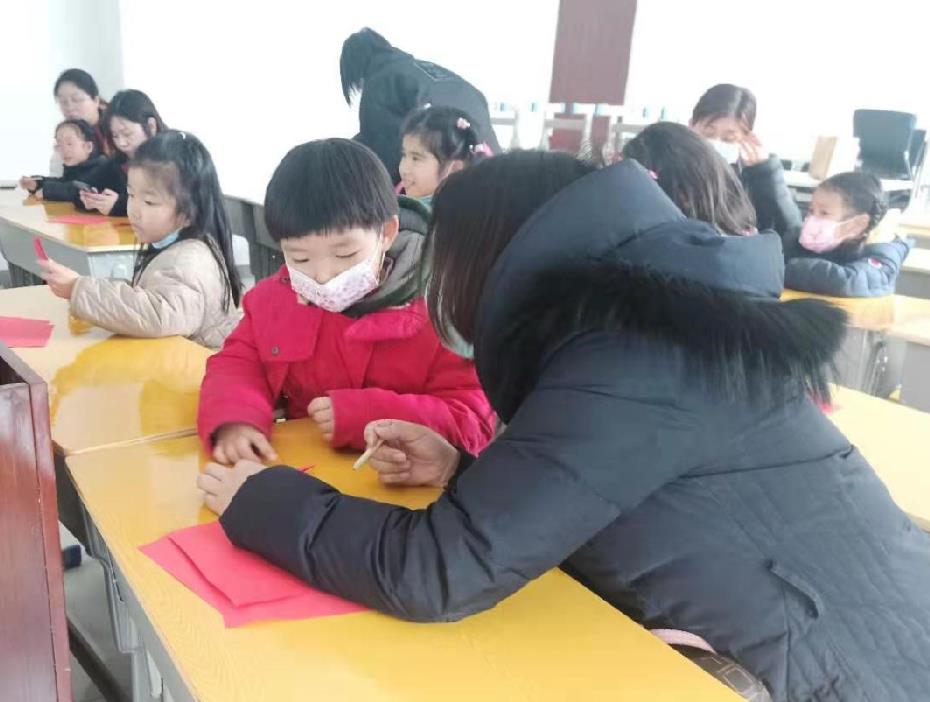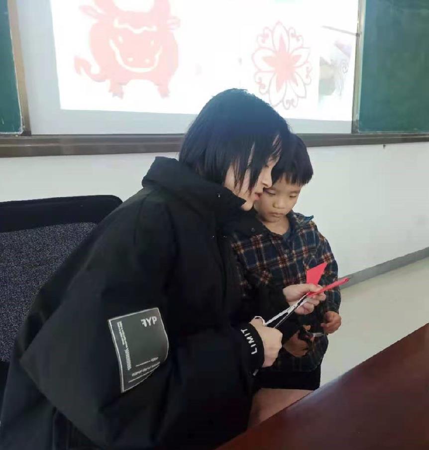 随后进入实操环节,考虑到剪纸过程中年龄较小的孩子的安全问题,家长也受邀进入课堂,和孩子们一起体验剪纸窗花的过程。在家长的陪同和帮助下,小朋友们非常耐心地跟随老师完成折纸、绘图、剪纸等步骤。遇到困难还积极主动询问老师,即使中途失败了,也不气馁,重新制作。