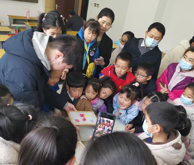 课堂上,孩子们在老师和家长的帮助下,在纸帘中将各色花草按照自己的设计图案进行摆放,再结合造纸术的方法,浇入纸浆或从一池花粥中捞出晾干,便能制作出一张张精美各异的花草纸。