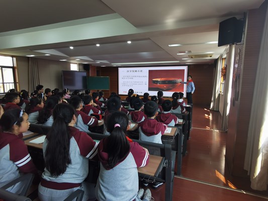 3月26日下午,南京市建康路小学四年级的小朋友在老师的带领下按顺序坐下,认真听课。南京师范大学文学院的高中正老师以《汉字的发展历史与汉字文化》为题,向小朋友们讲解汉字的起源于演变。