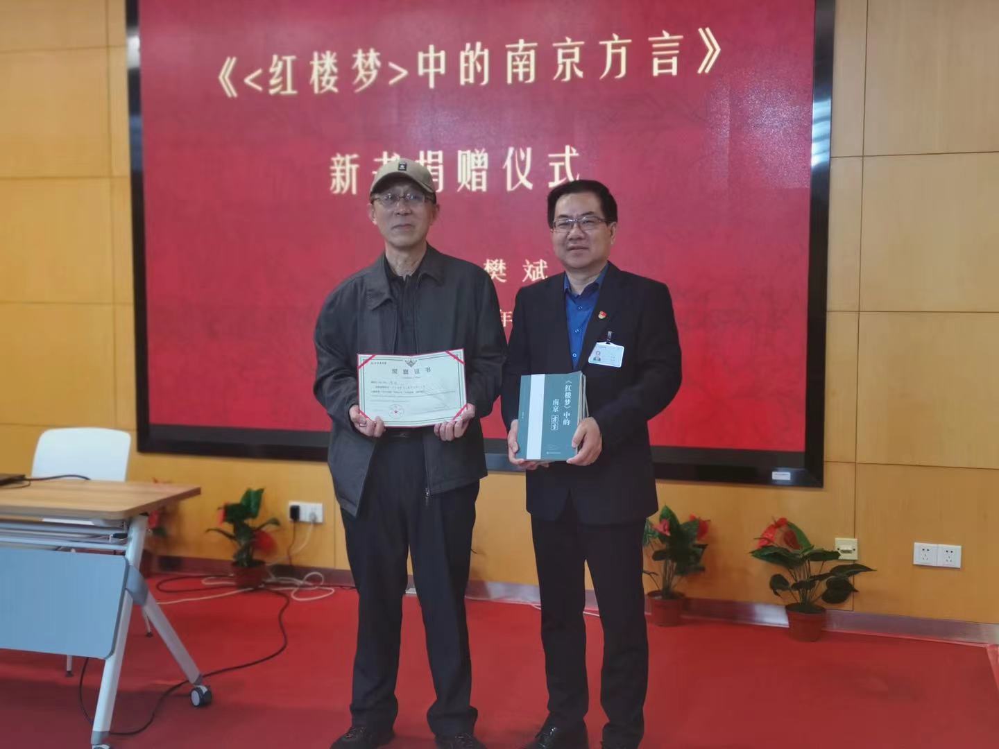 4月24日下午,由金陵图书馆和南京老门西文化守望者协会联合主办的《听“金陵十二钗”说南京方言》在金图成功举办。主讲嘉宾樊斌老师首先向金陵图书馆捐赠了新作《红楼梦中的南京方言》,金陵图书馆焦翔馆长为樊老师颁发了捐赠证书。