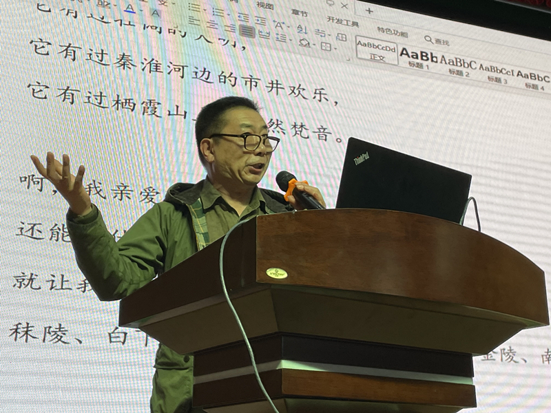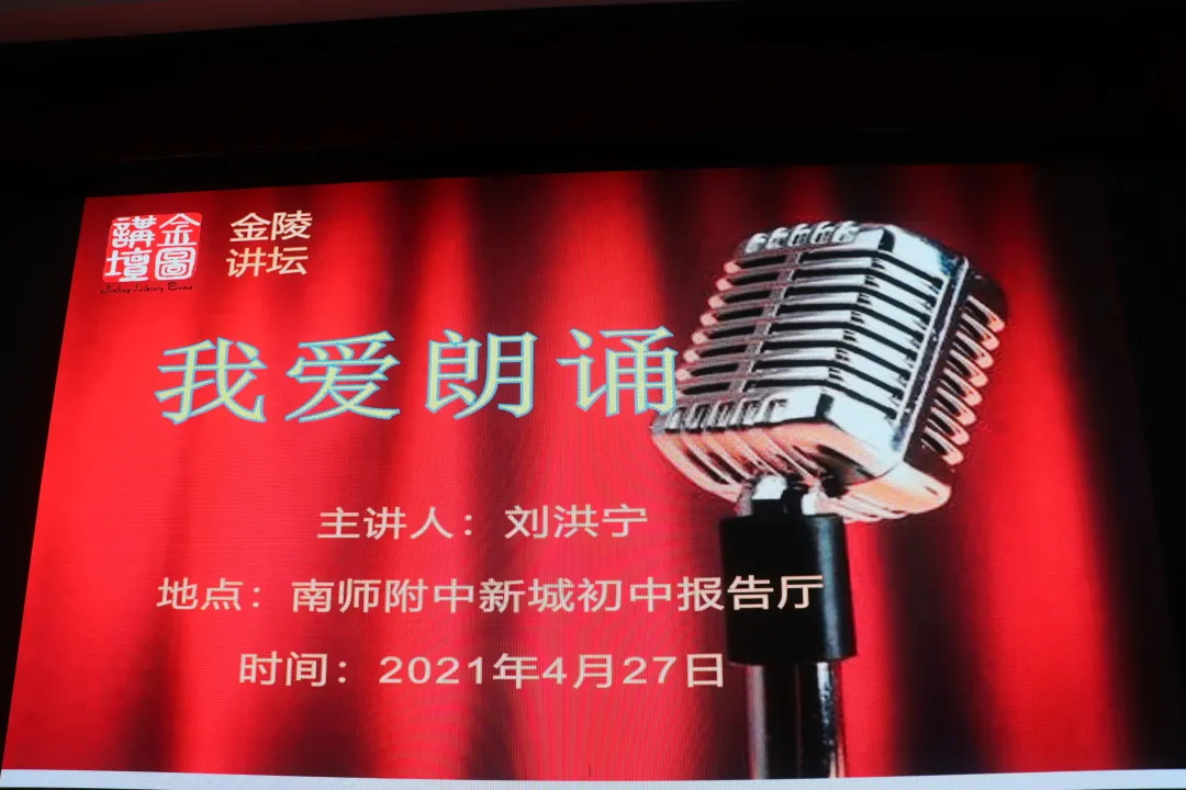 诵读经典,温润人生,启迪智慧,精彩的诵读能够让人品味中国传统文化的源远流长和博大精深。为了丰富校园文化,营造浓厚的书香氛围,激发学生的诵读热情,4月27日,南师附中新城初中举办了“金图讲坛”《我爱朗诵》主题讲座,本次活动在金陵图书馆的大力支持下特邀请了南京广电主任播音员、南京市朗诵协会副会长刘洪宁,刘老师多年来专注于广播文学节目播音制作,有长篇连播作品八千多集,计三千多个小时;短篇作品三千多篇,获全国及省市多个奖项。