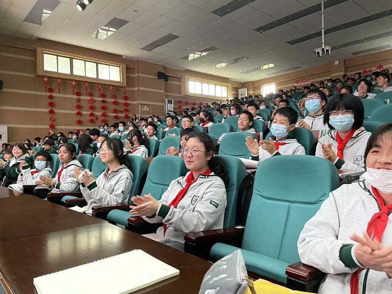 因防疫要求,初一全体学生采用部分班级在报告厅隔位就坐,其他学生在班里收看直播的方式参加活动,讲座由初一(8)班的袁绮宸主持。